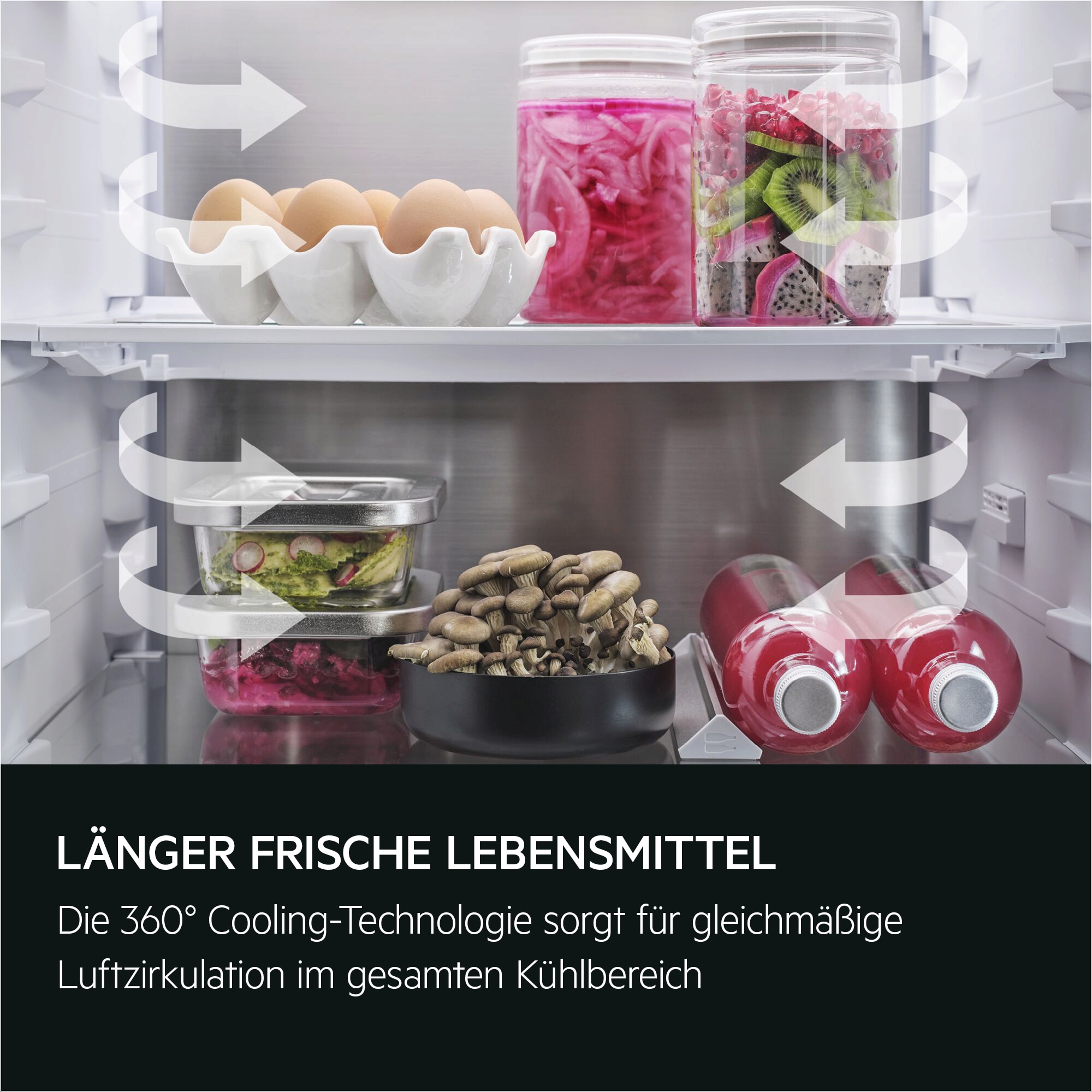 Die AEG 8000 Kühl-Gefrierkombinationen mit 360° Cooling-Technologie können dir helfen Food Waste um bis zu 28 %* zu reduzieren - dank besserer Luftzirkulation. Zahlreiche Luftkanäle und die Edelstahlrückwand sorgen für eine optimale Verteilung der Kühltemperatur.