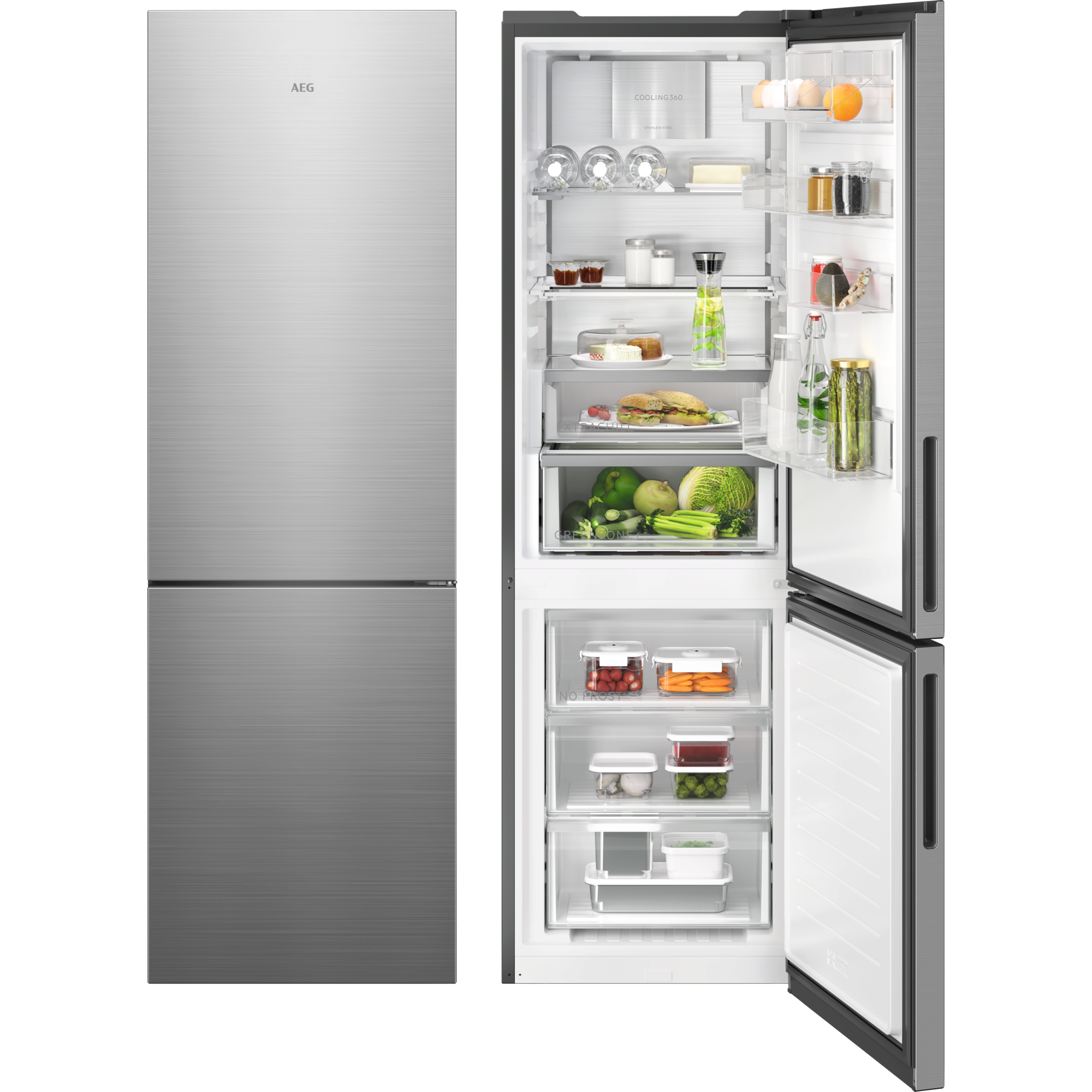 Die AEG 8000 Kühl-Gefrierkombinationen mit 360° Cooling-Technologie bewahren zuverlässig die Frische deiner Lebensmittel. Zahlreiche Luftkanäle und die Edelstahlrückwand stellen nach dem Öffnen der Tür die Temperatur schneller wieder her und sorgen für eine optimale Verteilung der Kühltemperatur.