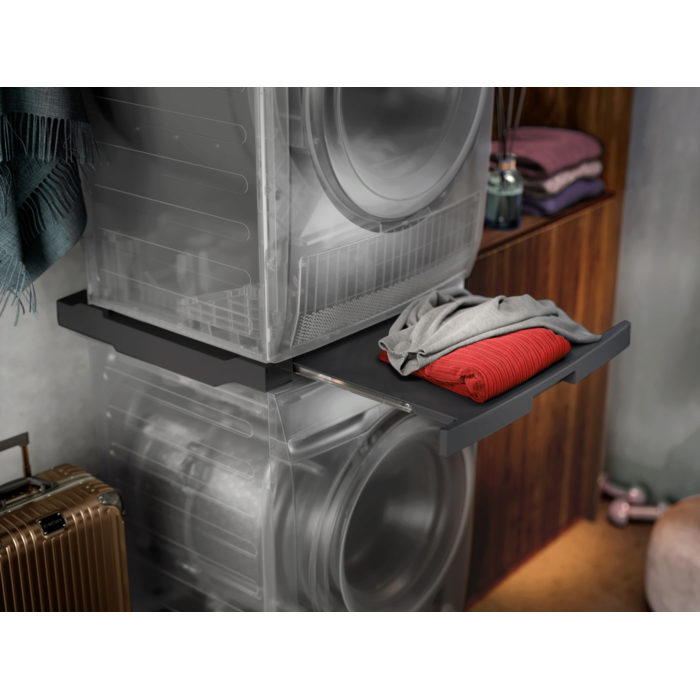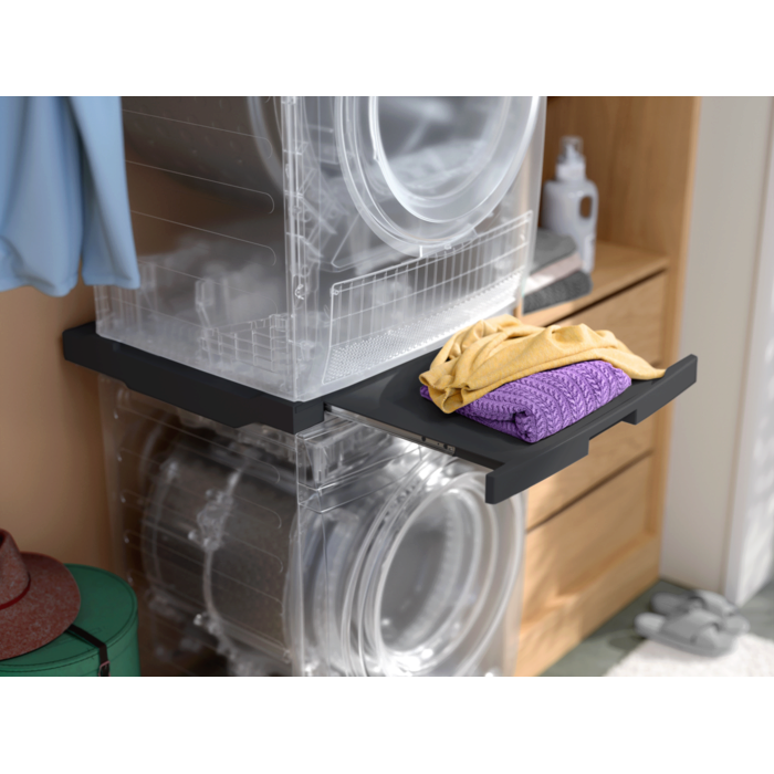 Mit diesem Verbindungssatz kannst du deinen Trockner einfach und sicher auf der Waschmaschine platzieren. So sorgst du im Handumdrehen für mehr Platz. Auf dem praktischen Auszug lässt sich deine Wäsche ganz bequem sortieren oder zusammenlegen.
