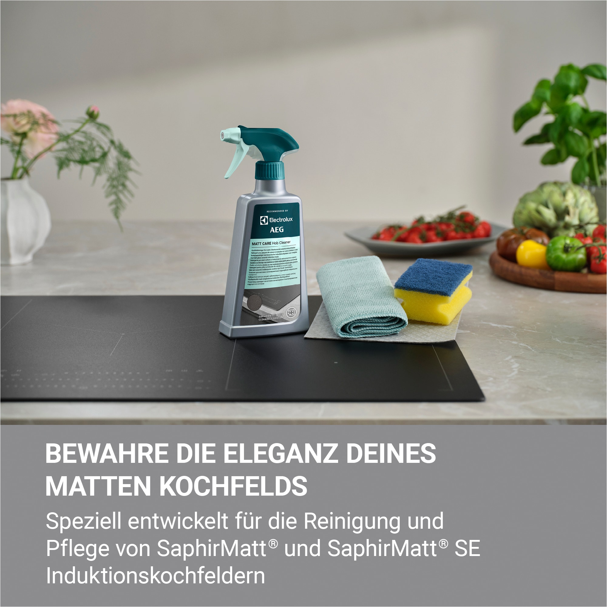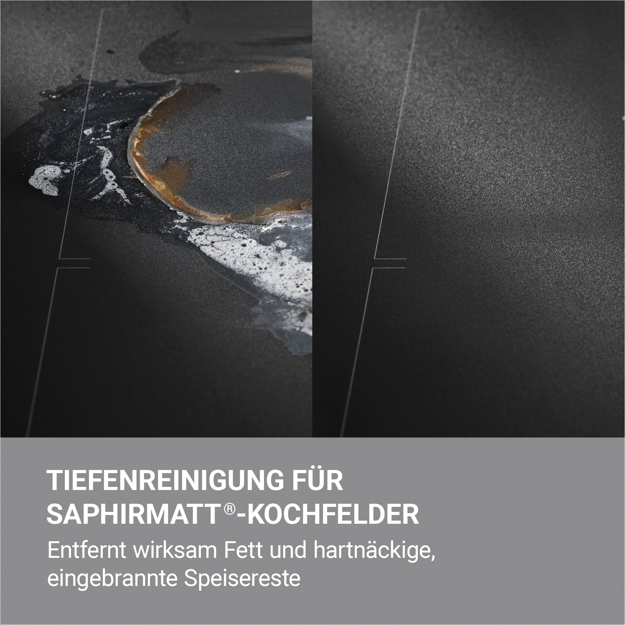 Der MattCare Kochfeldreiniger ist die Speziallösung für die Tiefenreinigung matter Glaskeramik-Induktionskochfelder – inklusive SaphirMatt® und SaphirMatt® SE*. Er entfernt hartnäckiges Fett und eingebrannte Rückstände – für ein dauerhaft sauberes Kochfeld.