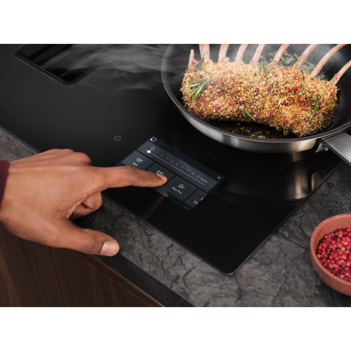 Die 9000 SensePro XTM Kochfelder mit integriertem Dunstabzug verfügen über einen kabellosen Gartgutsensor, der die Temperatur deiner Speisen misst und die Einstellungen des Kochfeldes für eine präzise Erwärmung automatisch anpasst. Selbst SousVide ist möglich.
