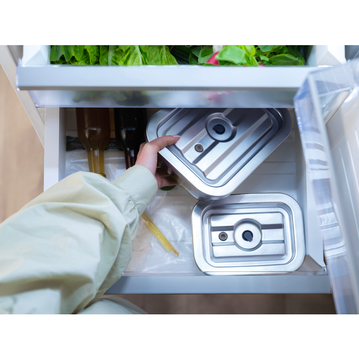 ¹ Nach internen Testergebnissen, bei denen Äpfel, Avocados und Lachs verglichen wurden, die in einem Vakuum- und einem offenen Behälter im Kühlschrank gelagert wurden.