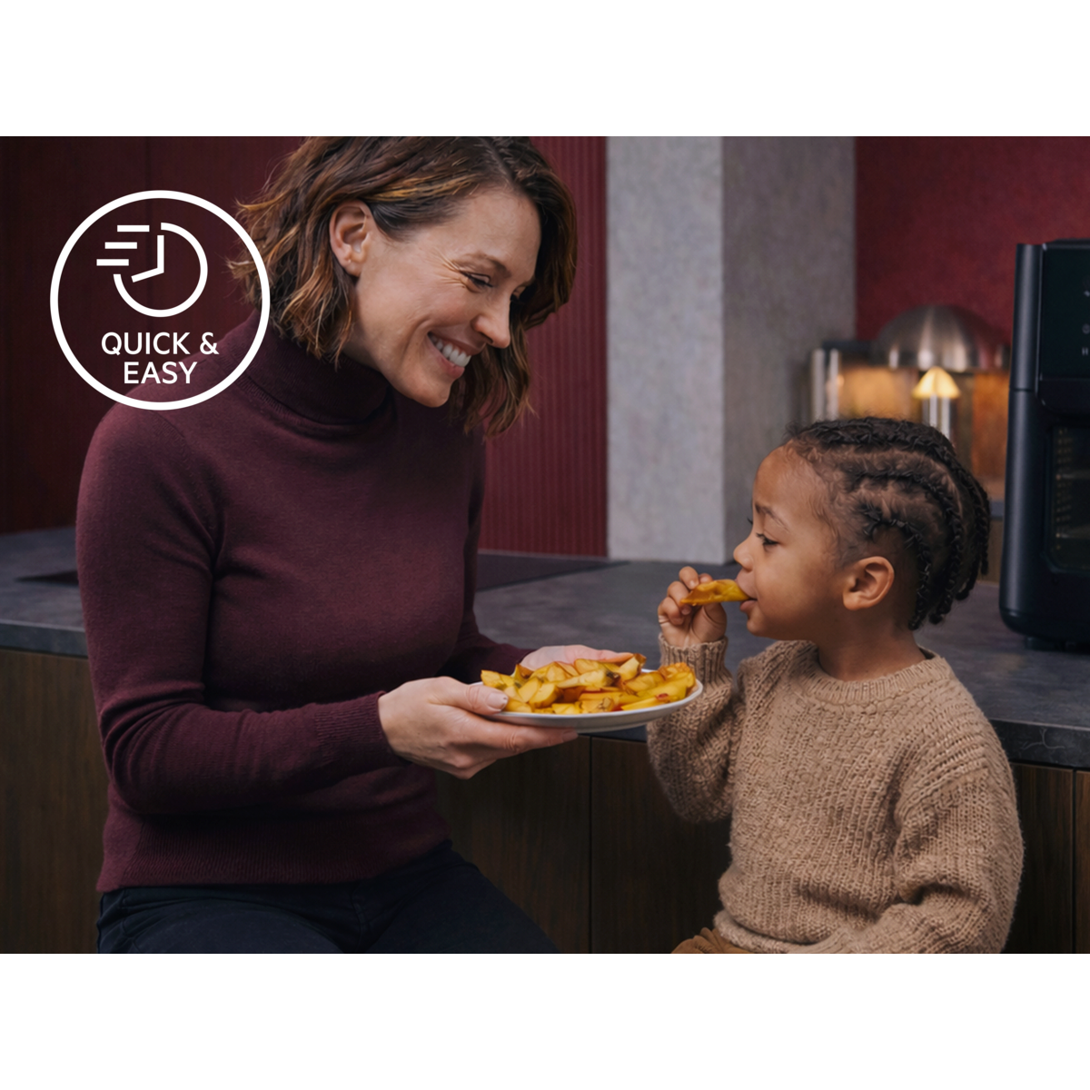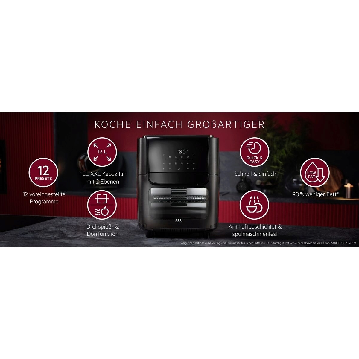 *Verglichen mit der Zubereitung von Pommes frites in der Fritteuse. Test durchgeführt von einem akkreditieren Labor (ISO/IEC 17025:2017).