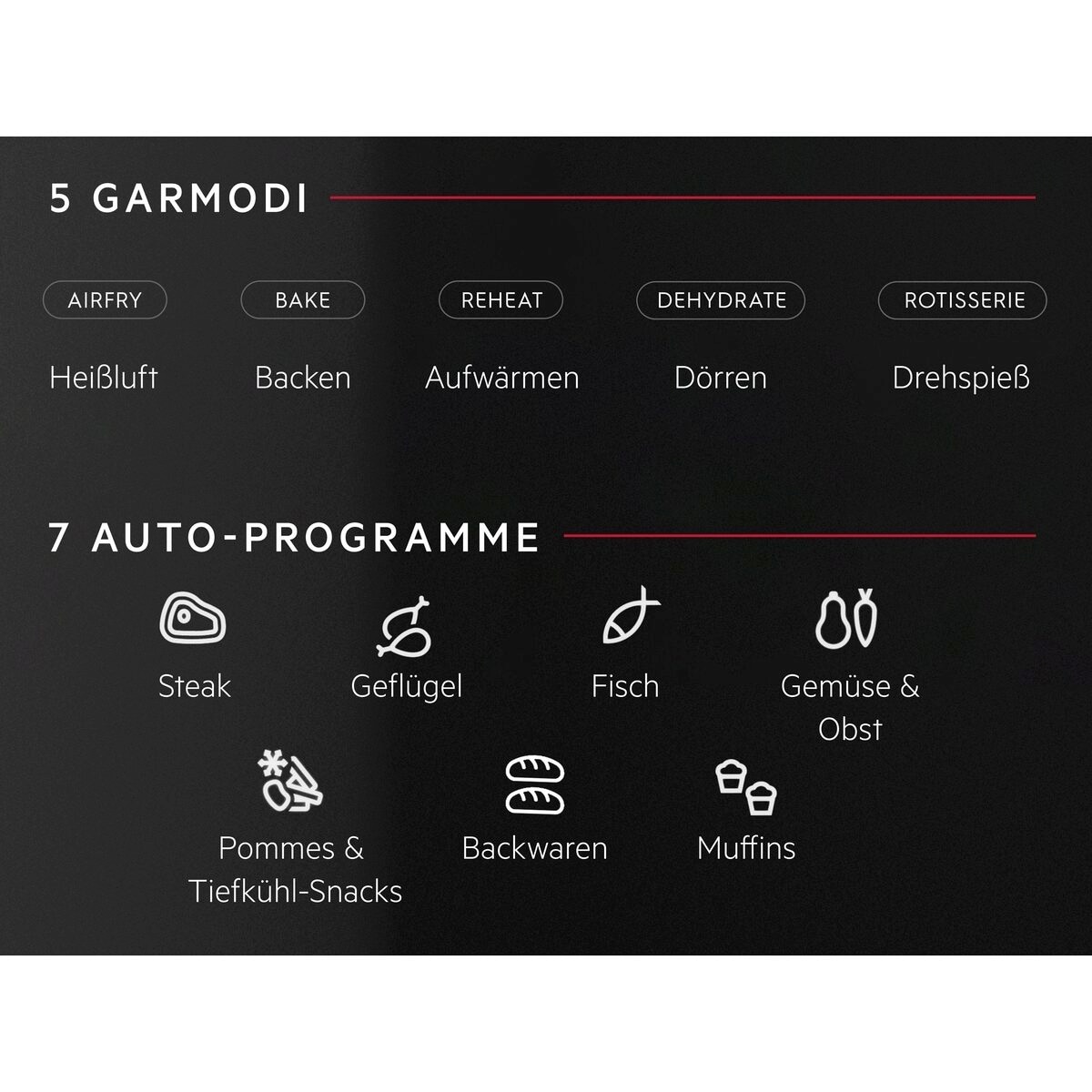 5 Programme bieten maximale Flexibilität. Die 8000 Heißluftfritteuse XXL - Multi-Combo bietet Platz für große Portionen, mit Funktionen wie Heißluftfrittieren, Backen, Aufwärmen, Dörren und Grillspieß. Durch das Glasfenster hast du den Garvorgang im Blick, ohne die Tür öffnen zu müssen.