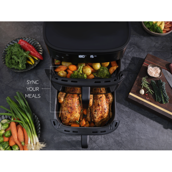 Kapazität ohne Kompromisse. Für die ganze Familie schnell eine gesunde Mahlzeit auf den Tisch zu bringen, war noch nie so einfach. Das Doppelkorb-System ermöglicht Familienportionen ohne Kompromisse bei Geschmack oder Textur.