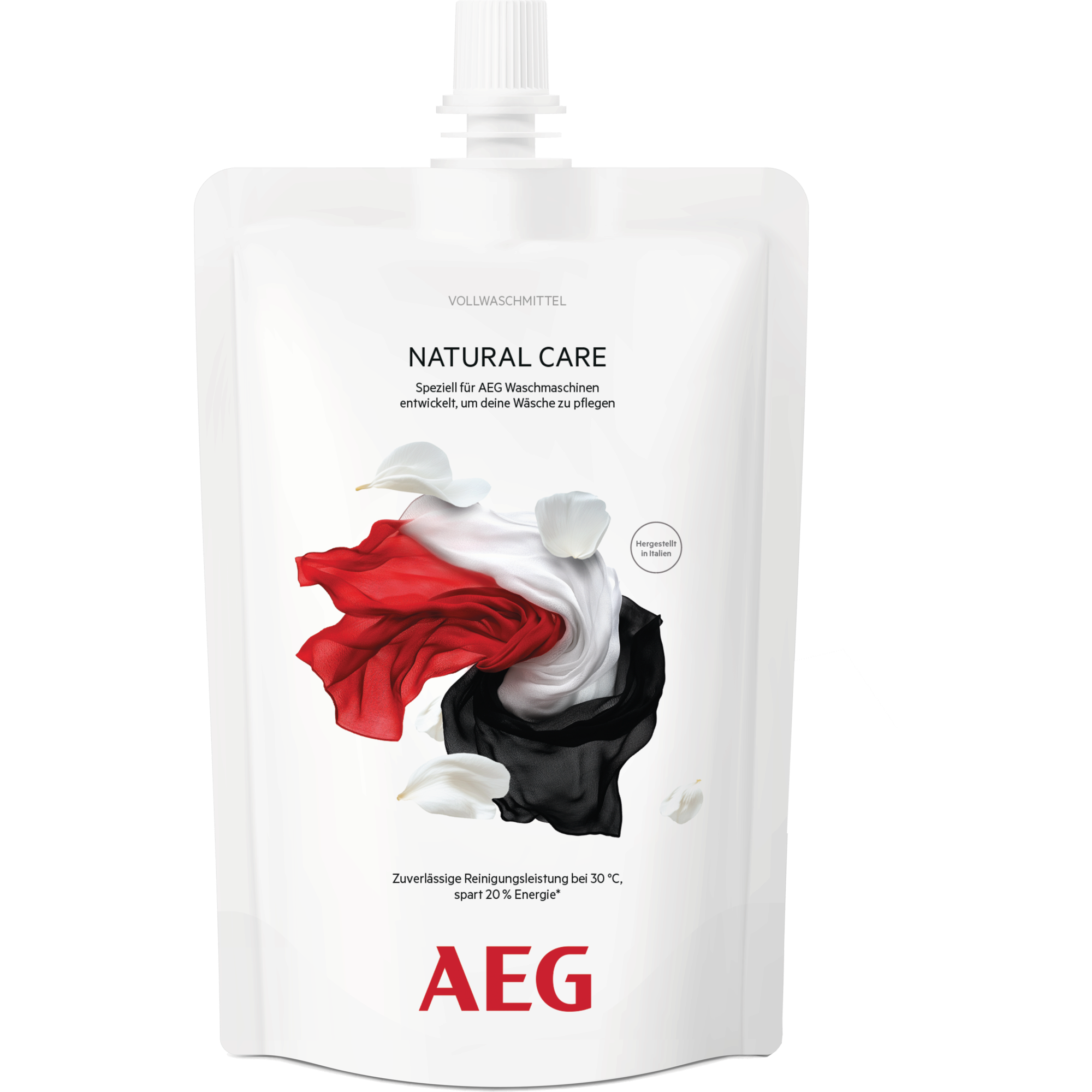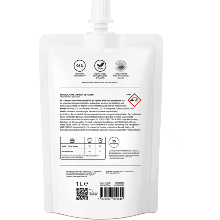 Das Natural Care Waschmittel wurde speziell für AEG Waschmaschinen entwickelt – für zuverlässige Reinigungsleistung bei nur 30 °C.