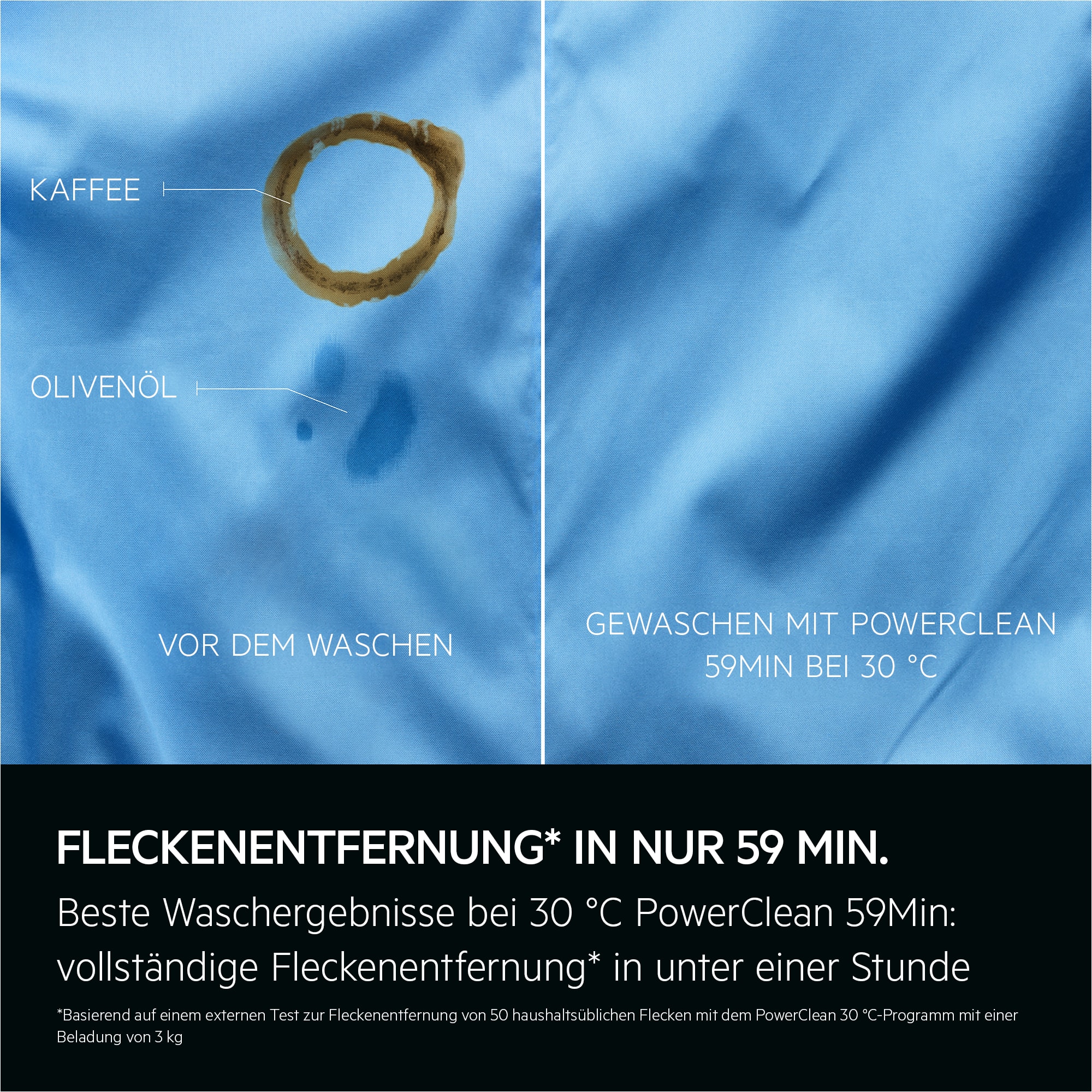 *Basierend auf einem externen Test zur Fleckenentfernung von 50 haushaltsüblichen Flecken mit dem PowerClean 30 °C-Programm mit 3 kg Beladung.
