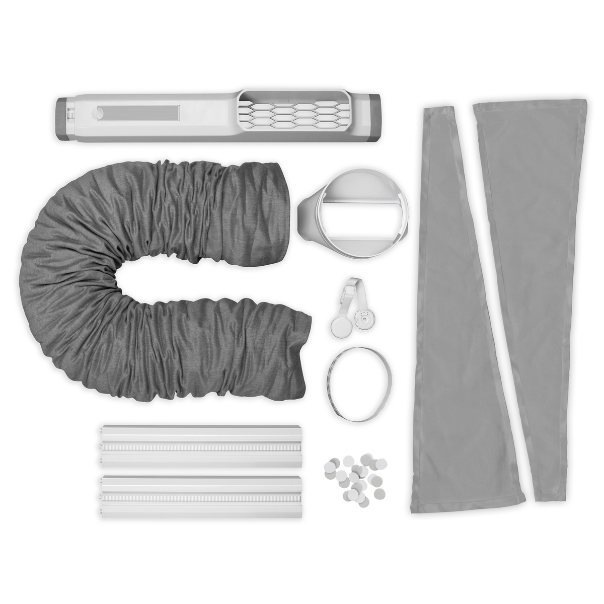 Lieferumfang: 1x Fensterleiste, 1x Schlauchschutz, 1x Schlauchhalterung, 1x Fensterrahmenverbindung, 2x Erweiterungsstücke, 1x Abdeckung, 2x Textilstücke, Klettpunkte