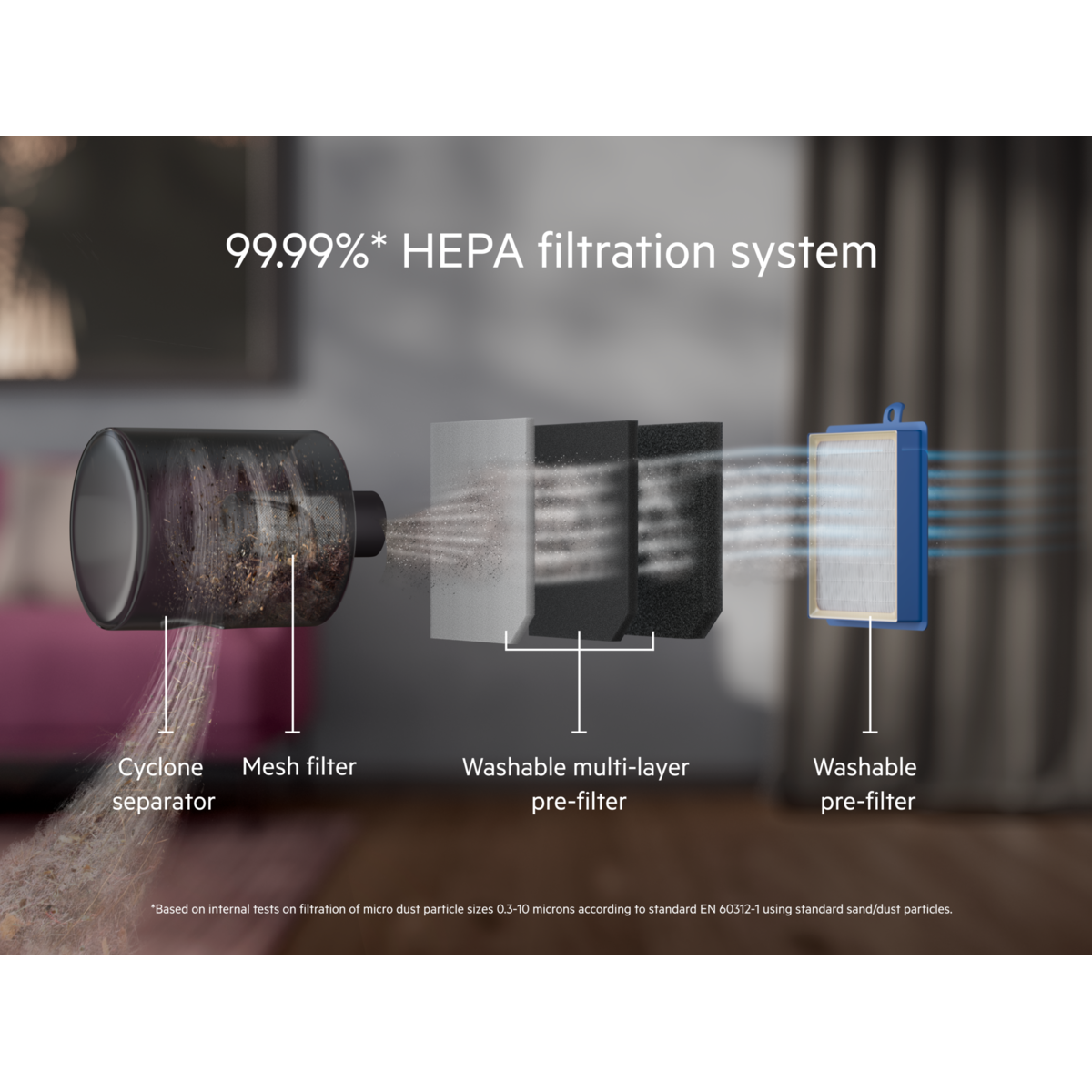 * Basierend auf internen Tests zur Filtration von Mikrostaubpartikeln der Größe 0,3–10 Mikrometer gemäß der Norm EN 60312-1 unter Verwendung von Standardsand/Staubpartikeln.