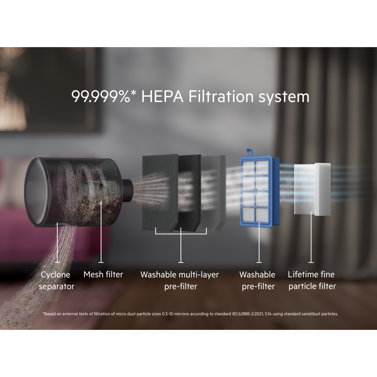*Basierend auf internen Tests zur Filtration von Mikrostaubpartikeln der Größe 0,3-10 Mikrometer gemäß der Norm IEC62885-2:2021, 5.14 unter Verwendung von Standardsand/Staubpartikeln.