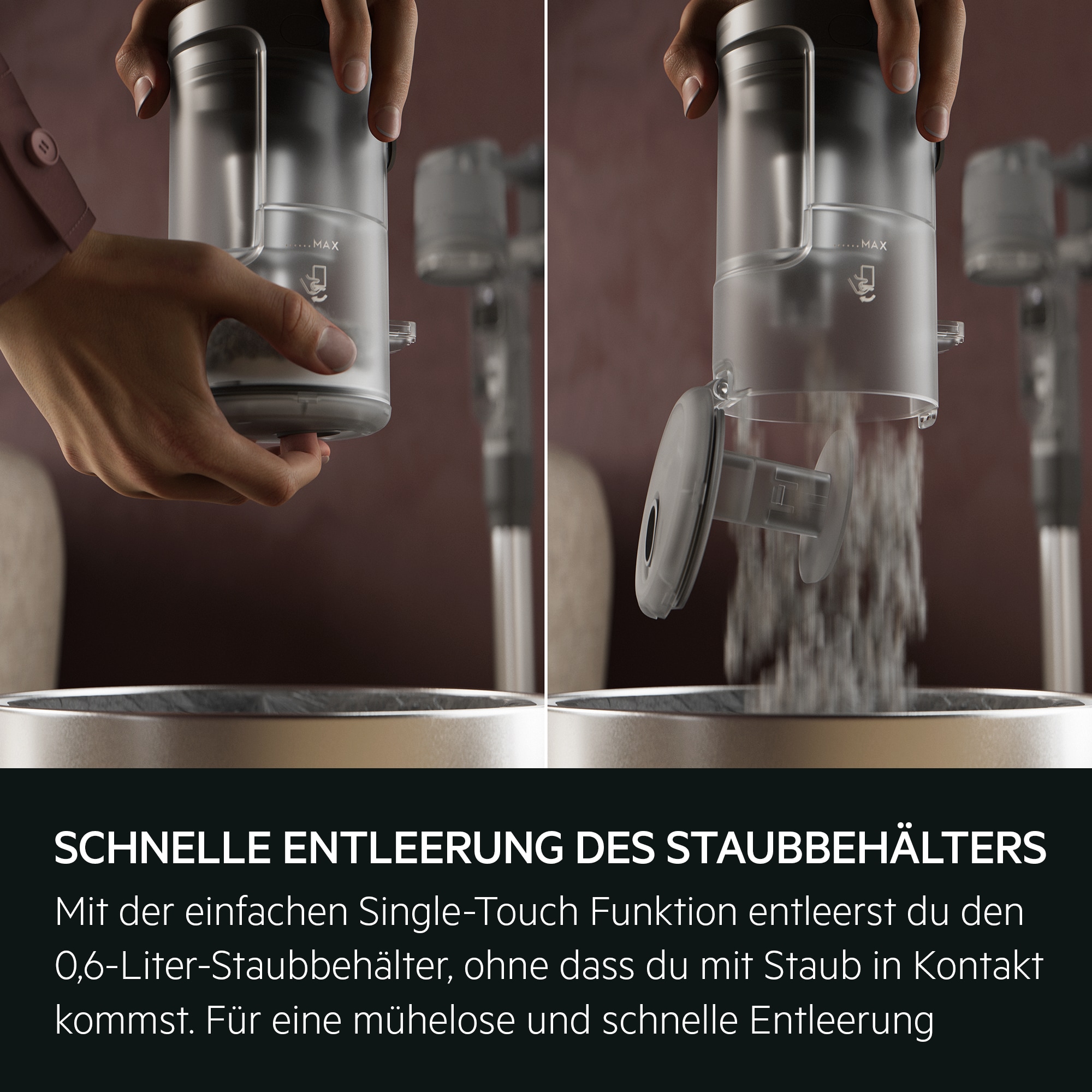 Schnelle Entleerung des Staubbehälters – kein Kontakt mit Staub