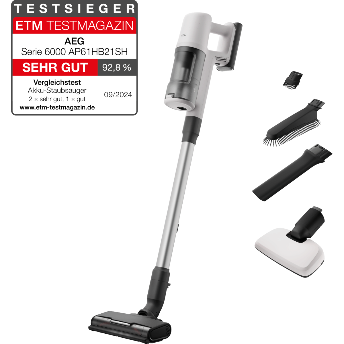 Der AEG Serie 6000 Akku-Staubsauger AP61HB21SH wurde im Heft 09/2024 mit SEHR GUT bewertet.