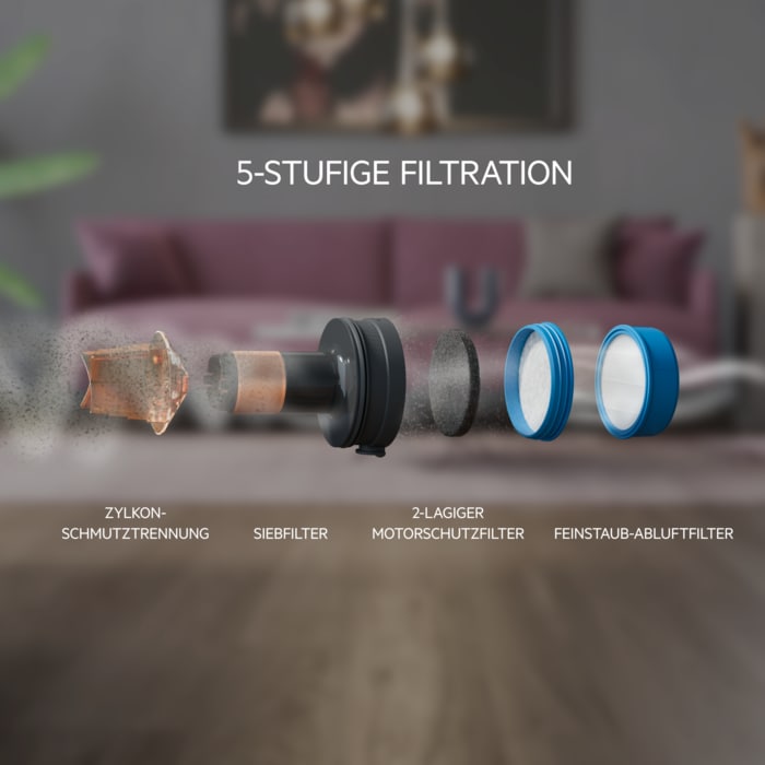 *Basierend auf internen Tests am Handteil gemäß IEC 62885-4, wobei der Staubsauger auf minimaler Leistungseinstellung eingeschaltet ist. Die Messung wird am entnommenen Handteil durchgeführt.