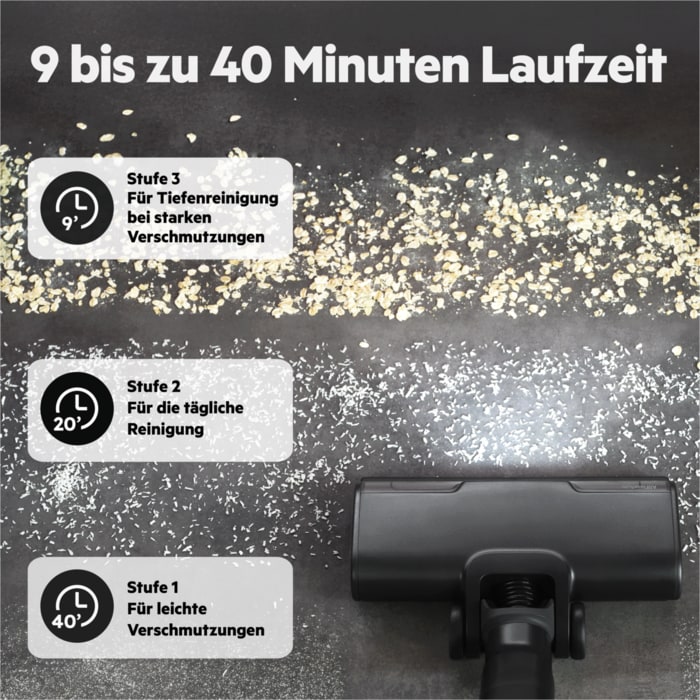 *Im Vergleich zum Boost-Modus **Basierend auf internen Tests gemäß Norm IEC 62885-4 (Laufzeitmessung Handteil und Gesamtgerät im Min-Modus). ***Basiert auf internem Test, bei dem zur vollen Abdeckung bei einer Geschwindigkeit von 0,5 m/s jeweils beim vorwärts-/ rückwärts Saugen verwendet wurde.