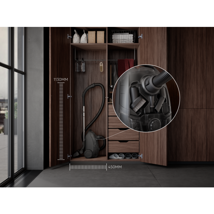 Der kompakte 5000 Staubsauger entfernt effizient Staub und Schmutz von allen Bodenbelägen. Mit der AllFloor Bodendüse kannst du problemlos von Hartböden auf Teppiche wechseln. Weiteres Zubehör ist dank integrierter Ablage jederzeit griffbereit.